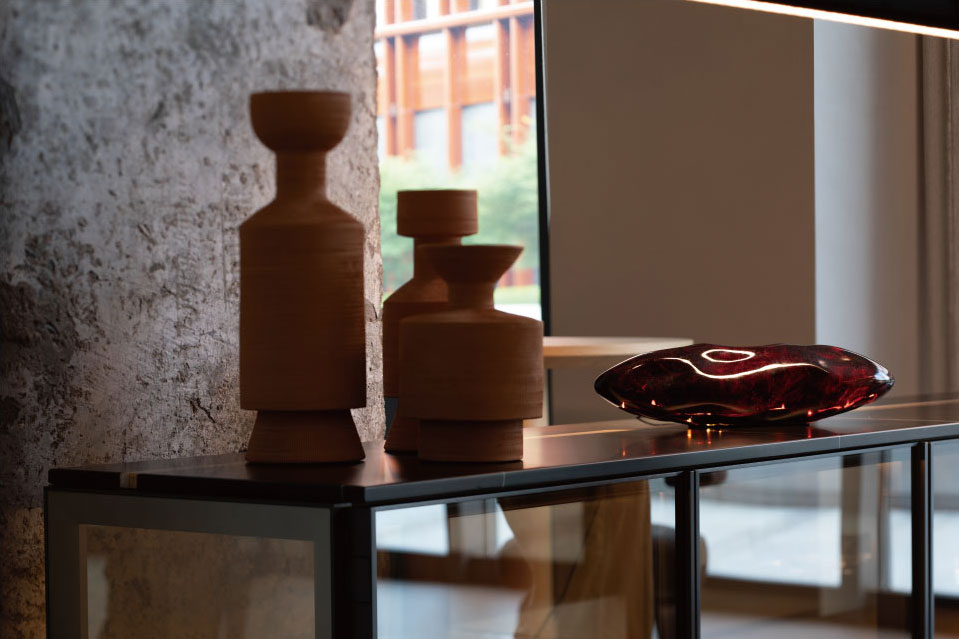 Collocata su un mobile basso nell'ingresso, la lampada Dreame, grazie alla sua striscia LED orientabile posta alle sue spalle, proietta una luce soffusa sulla parete. La luce si riflette sul muro, illuminando il vetro anticato della lampada. Insieme alla striscia LED sottostante, questa illuminazione bidimensionale esalta i dettagli intricati e i colori vivaci della lampada. Grazie al gioco di luci e ombre, la Dreame stessa diventa il punto focale dell'ingresso, catturando l'attenzione con naturalezza.