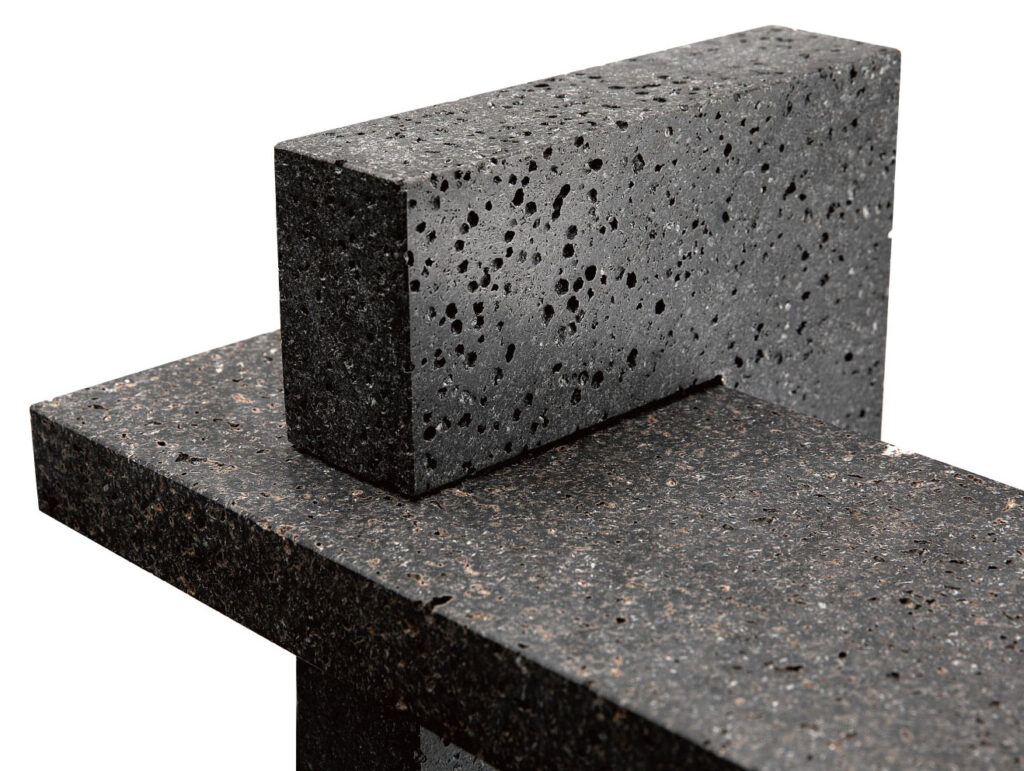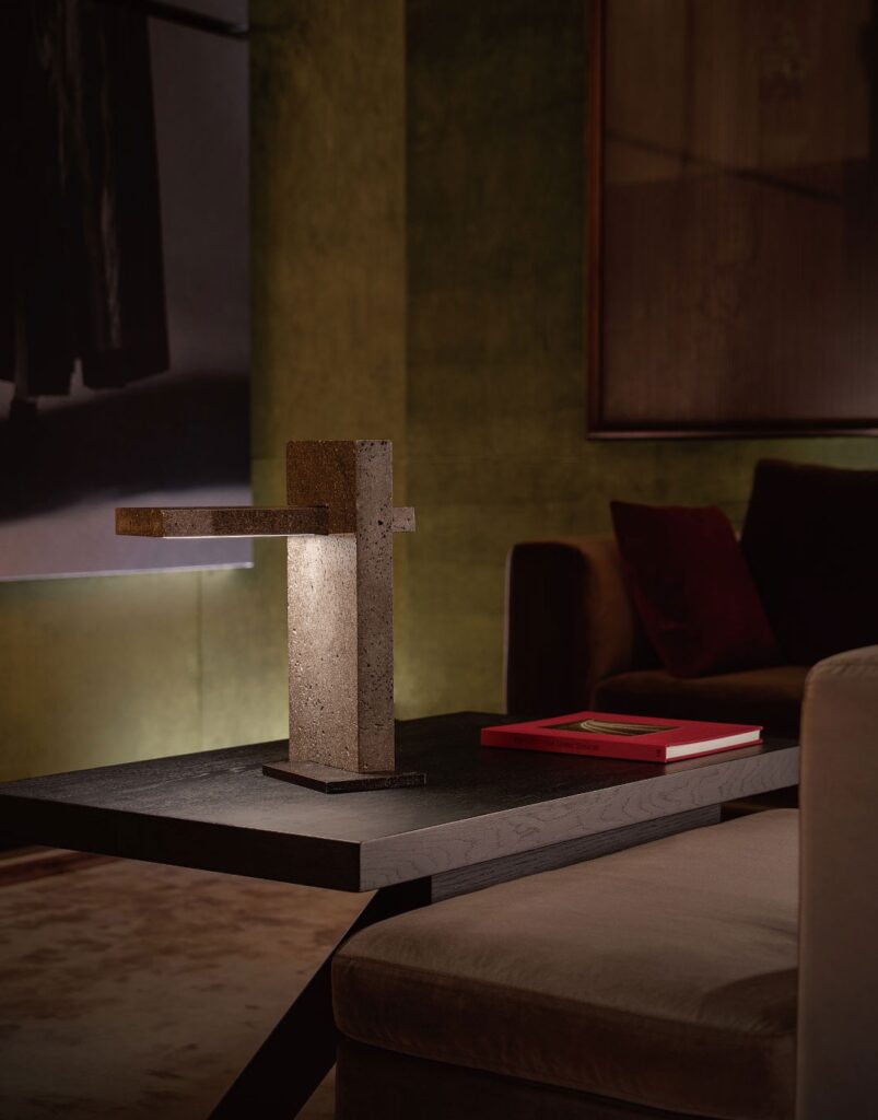 La rara pietra naturale esalta la qualità della luce e dell'ombra, aggiungendo profondità e consistenza all'illuminazione.