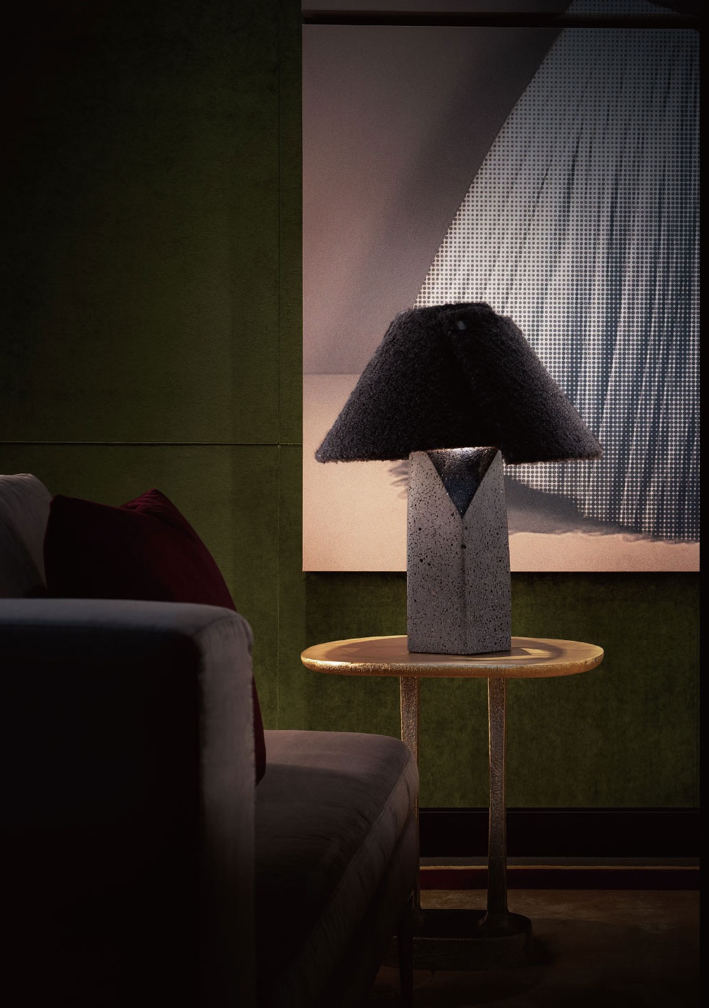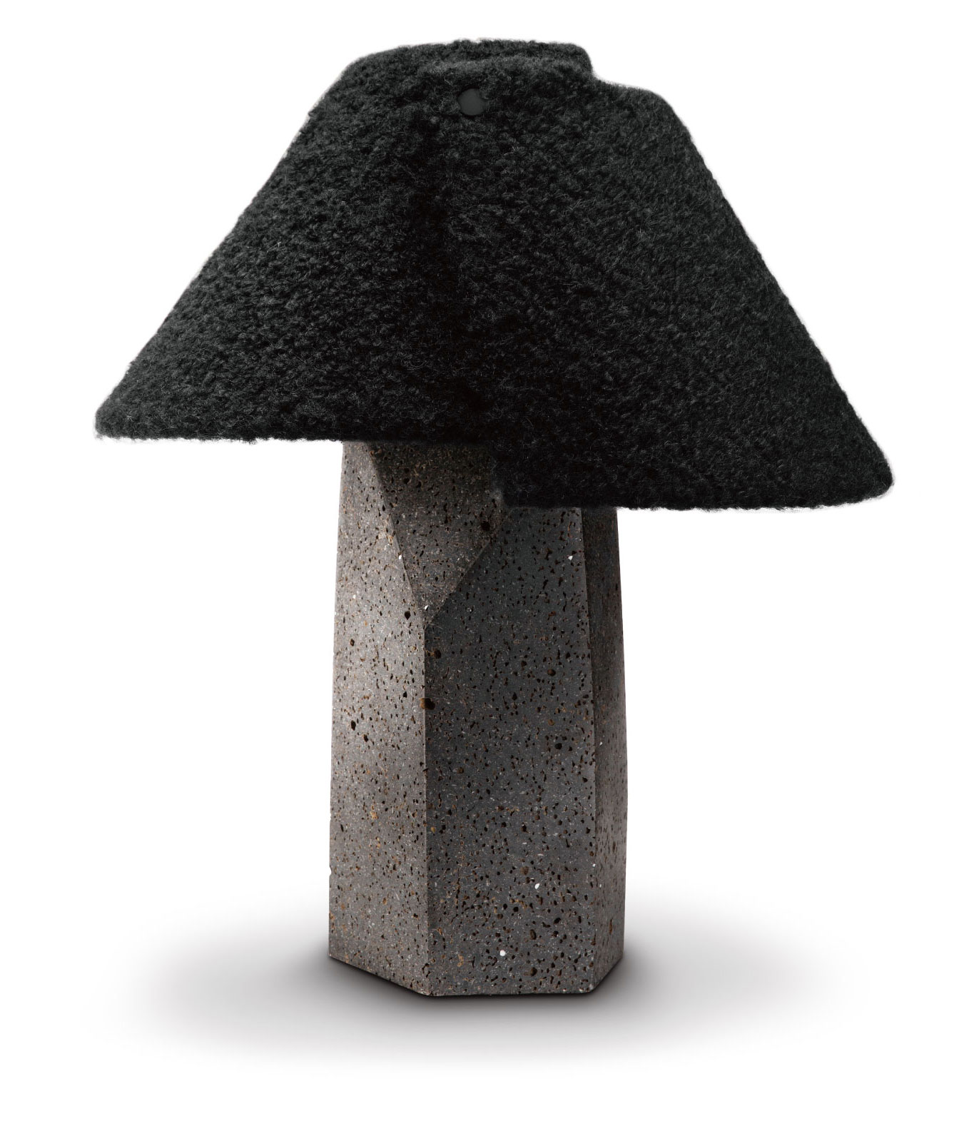 Il paralume in lana nera, abbinato al travertino nero, crea un'elegante lampada da tavolo con luce rivolta verso il basso. Il paralume è inoltre dotato di una chiusura finemente lavorata, che aggiunge un tocco di originalità.