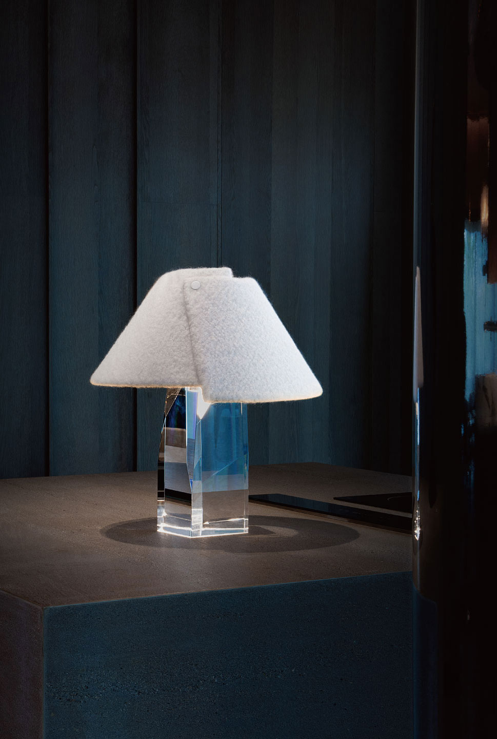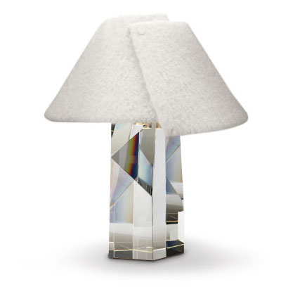 Una versione presenta un paralume in lana naturale bianca opaca con una solida base in vetro di cristallo sottostante. Il faretto all'interno del paralume illuminerà l'intera superficie trasparente in vetro di cristallo.