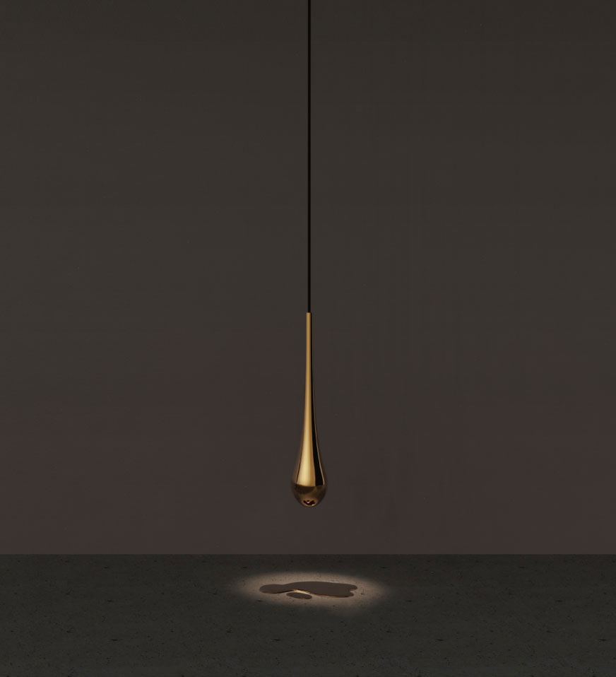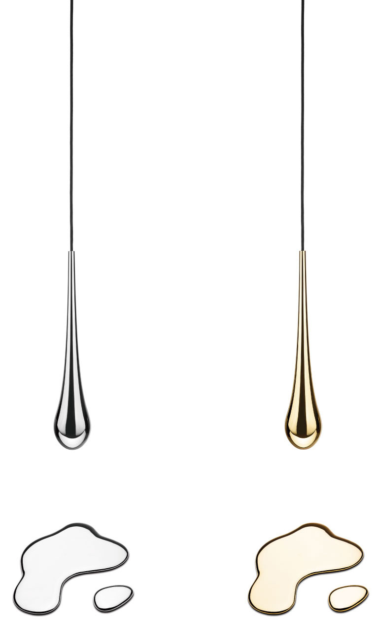 Inspired by the natural beauty of a waterdrop, this pendant light is crafted in bright silver or bright gold finish. To complete the look, each pendant light comes with a matching “puddle of water” base in the same finish, creating a cohesive and artistic visual statement.