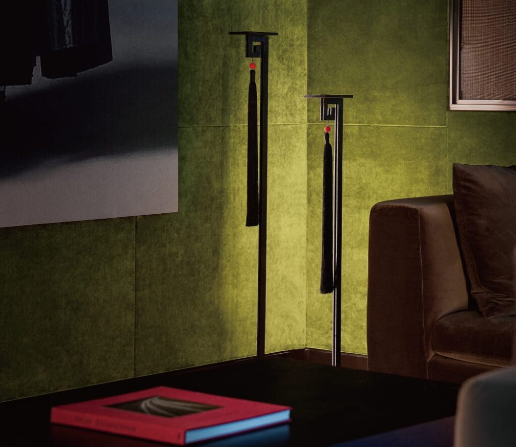 During the day, the tall and short Black Amber candle holders serve as elegant floor ornaments