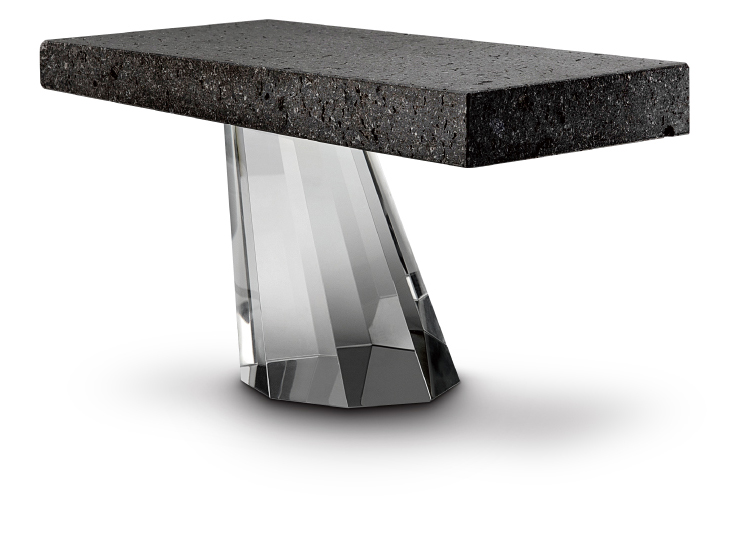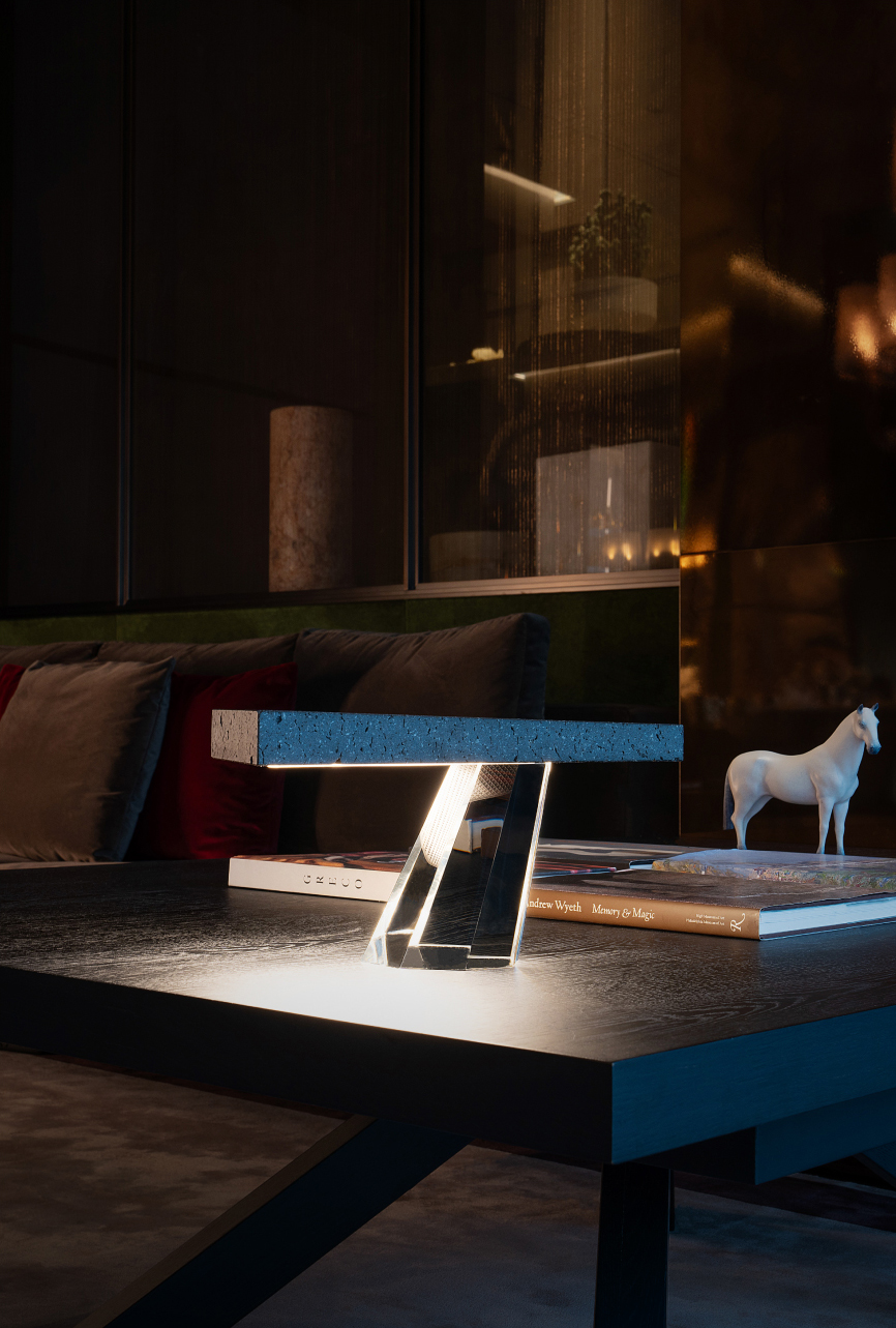Il design angolato in cristallo sorregge un pezzo di rara pietra naturale che emette una luce verso il basso, creando un effetto elegante e affascinante.