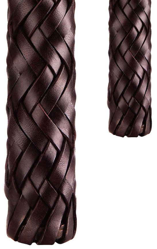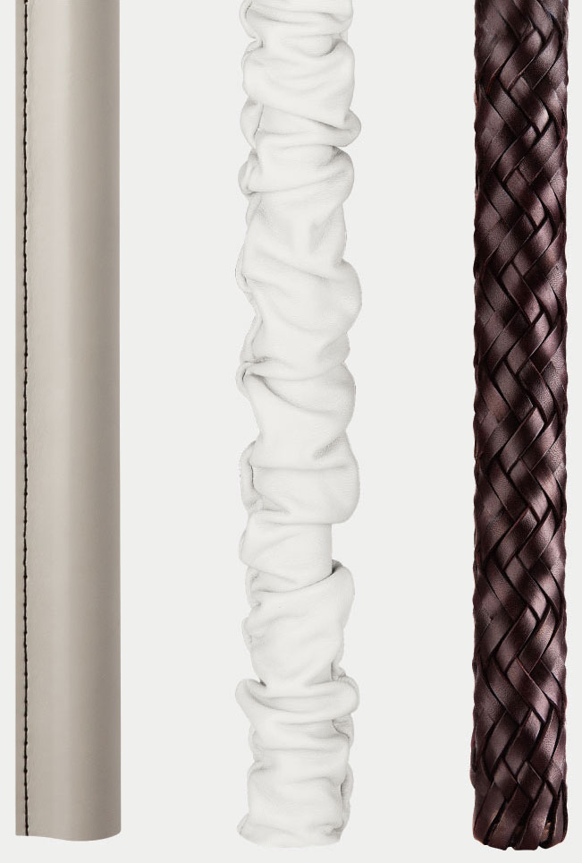 Hand-braided natural cowhide adds a rich, textured finish. Soft, cozy lambskin enhances its gentle and inviting character. Sleek natural saddle leather completes the lamp with a minimalist and refined design.
